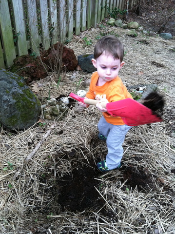 "Get Daddy shovel and you dig too Daddy!" he said. So I took the larger shovel and made a few dents in the soil, but mostly wanted to watch him. Here his face shows his late grandmother's determination and concentration. He looks like my mom sometimes. She loved gardening too, as does Lydia, as I do.
