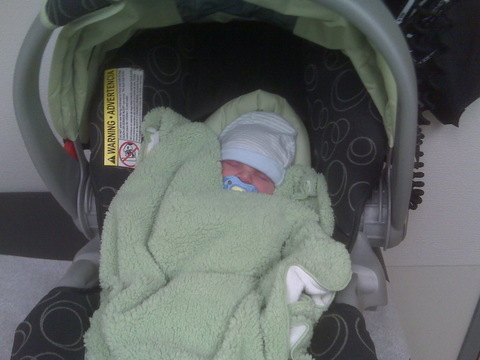 Finn ready to return home from his first visit to the pediatrician (it went well).