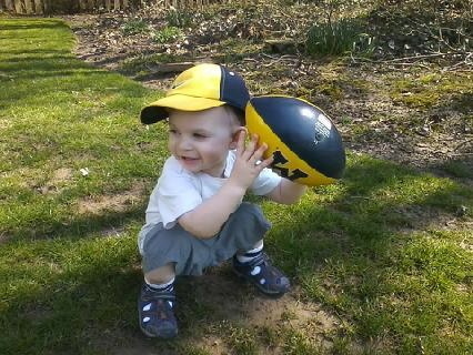 As sports fans know, the Cleveland Browns have had their share of quarterback woes. Finally, they have a serious prospect. Be looking for U of MI QB, class of 2031, to finally get them to the Super Bowl. (OK, Finn already had the hat and the ball is a neighbor's, but Michigan does recruit early. And look at that form!)