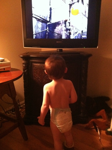 Finn, as you can see from the photo I've posted on my bio/gallery page, and to the left on this page, loves balloon. I took this photo of him in May. His wonder and joy in seeing and playing with balloons remains. In the photo on this blog post, Finn is watching THE RED BALLOON with rapt attention. And for reasons known only to the maker of my camera phone, the red balloon in the picture -- the one on the TV -- comes out yellow.