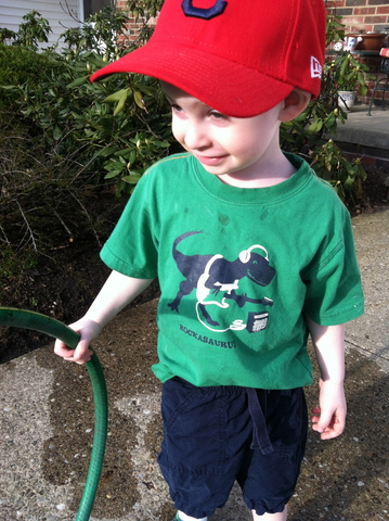 A few days after making daffodil soup, Finn wanted to help his mommy wash his car. The sun was shining brightly (for a welcome change) and we couldn't find his little cap, so I tightened my Cleveland Indians cap as much as I could and it worked fine.