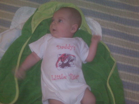 Here's a shout out to the Chagrin Falls High School Class of 1970, and a thank you to Jackie and the others who gave us a "Daddy's Little Tiger" onesie last summer. Finn's a tall baby, so at six and a half weeks, he's already able to wear it (it's for-one-year-olds). He'll be able to wear it for quite a while. We put this on him after his bath. Thanks, guys, and here's to the CFHS Class of 1970, and Finn's graduating class of '29. (That's 2029, folks.) Read More