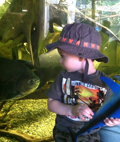 On a visit to the Cleveland Zoo, Finn enjoyed the animals with two and four legs. But it was only when we entered the aquatic area that he was most fascinated and joyful. Here he and a grouper seem to be eyeing each other with gentle curiosity. A few moments later he was jumping up and down in front of a fish tank, overcome with joy at the colorful fish. "There's another one and another one and another one!" he shouted out happily, as other little boys followed suit.